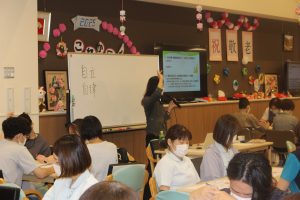 こうした状況を受けて、にぎたつ苑では9月に全職員を対象とした「接遇・マナーを実践しよう」というテーマで研修会を開催いたしました。講師には、(公財)介護労働安定センター愛媛支部でS・I・Cオフィス代表を務める河野久美子先生をお招きしました。河野先生は人材コンサルタントとして活躍されており、市内の大学でも教鞭をとるなど、幅広い分野でご活躍されています。研修では、介護の現場で大切な「接遇マナー(ホスピタリティマナー)」について、グループワークを交えながら学びました。先生の丁寧な説明と、参加者の積極的な意見交換により、職員一人ひとりがホスピタリティマナーの重要性を深く理解することができました。