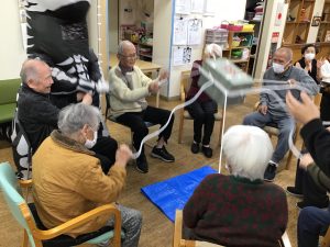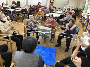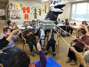 亥の子の歌をうたいながら、石に見立てた手作りの箱を一斉に引っ張ります!